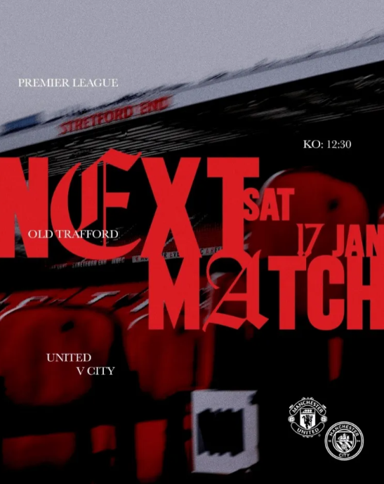 北京时间1月17日20点30分,曼联将在英超第22轮比赛中主场对阵曼城。 曼联官方社媒发布海报,预热这场重要的德比战,海报背景为老特拉福德球场。